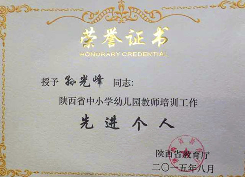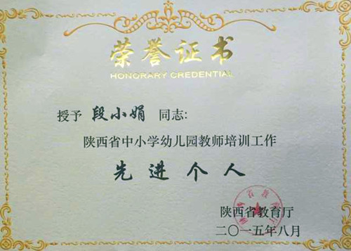 2015年8月31日,陕西省“国培计划”和省培项目启动会在陕西社会主义学院召开,对荣获陕西省中小学幼儿园教师培训工作先进集体和先进个人举行了表彰。我院荣获“陕西省教育厅中小学幼儿园教师培训工作先进集体”荣誉称号,“幼师国培”项目首席专家孙光峰及项目实施班主任段小娟获得“陕西省教育厅中小学幼儿园教师培训工作先进个人”荣誉称号。(段小娟)