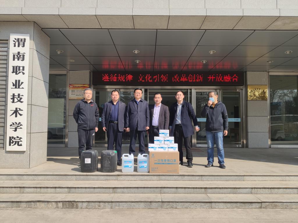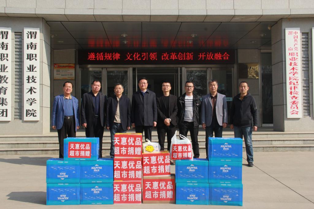“同舟共济度时艰,众志成城战疫情。”3月23日上午,两家爱心企业带着浓浓的爱心来到学校,为今年会捐赠大批防疫物资,助力学校疫情防控工作。渭南天惠优品超市经理袁新一行四人,给学校捐赠了500个医用一次性口罩,医用红外额温计2支,120瓶84消毒液,30瓶医用酒精,240瓶矿泉水。西安食通餐饮管理有限公司总经理杨小红一行2人,为学校捐赠了600个一次性口罩,100升84消毒液,2桶医用酒精。