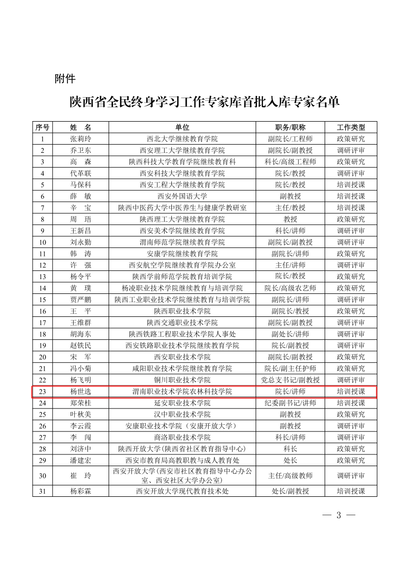 根据《陕西省教育厅办公室关于公布陕西省全民终身学习工作专家库首批入库专家名单的通知》(陕教职办〔2022〕21 号),今年会农林科技学院院长杨世选成功入选全民终身学习工作专家库首批入库专家。