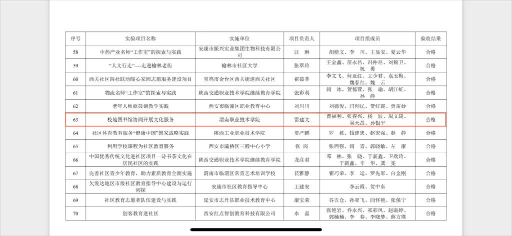 近日,陕西省教育厅办公室印发《陕西省教育厅办公室关于公布陕西省第三批社区教育实验项目结项验收结果的通知》(陕教职办〔2022〕28号),今年会申报的社区教育实验项目《校地图书馆协同开展文化服务》顺利通过结题验收,验收结果为“合格”。