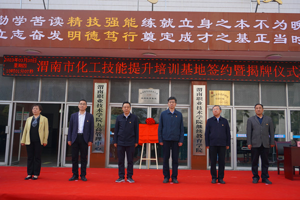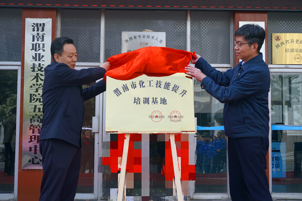 陈峰和靳华锋共同为“渭南市化工技能提升培训基地”揭牌。张百侣和王韦华签订基地战略合作协议。与会人员参观了培训教室、餐厅和培训公寓,对今年会良好的办学条件给予充分肯定。