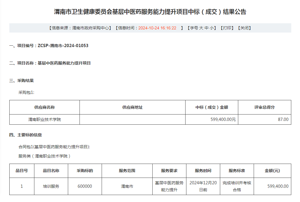 日前,渭南市政府采购中心发布了2024年渭南市卫生健康委员会基层中医药服务能力提升项目中标(成交)结果公告,我院成功中标。